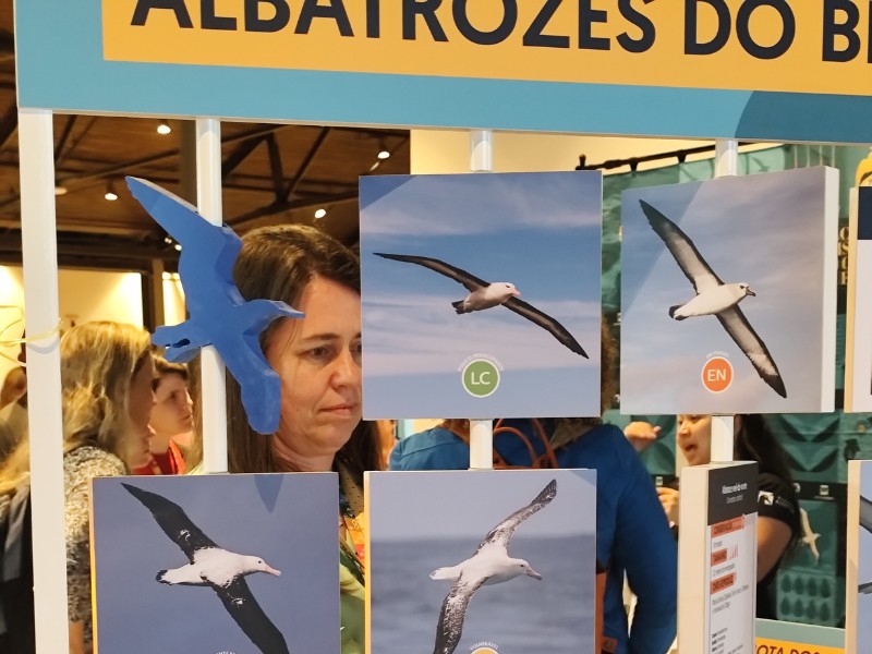 Em cada material exposto pelo projeto, havia uma oportunidade de mergulhar na temática oceânica e aprender mais sobre as aves marinhas. Um deles, um globo terrestre que mostra as rotas de voo dos albatrozes ao redor do mundo, chamou atenção dos visitantes, assim como o painel de asas, que compara a envergadura do albatroz-viageiro (Diomedea exulans), que pode chegar a 3,5m, a outras aves conhecidas, como a gaivota (Larus dominicanus) e o bem-te-vi (Pitangus sulphuratus).