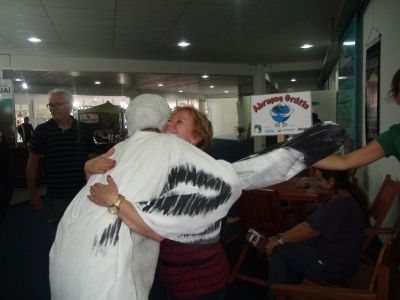 Já no dia 18, o asilo Dom Bosco, que atende 77 idosos carentes, recebeu a visita da assistente de Educação Ambiental do Projeto Albatroz, Cynthia Ranieri, fantasiada de albatroz. A perfomance faz parte da ação “Abraços Grátis”, promovida pelo Projeto Albatroz.
