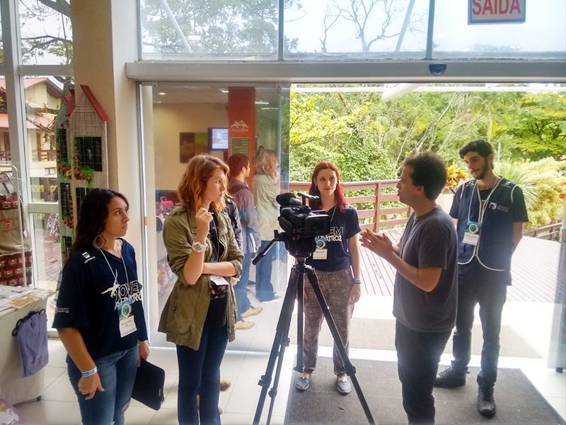 Mariana Roedel, Vitor Vasques Ribeiro e Maria Luiza de Castro, alunos do curso de Educomunicação do CJA, conduziram, ao lado de outros 13 voluntários, roteiros, entrevistas, captações de áudio e vídeo que deram origem ao produto audiovisual do evento, que pode ser assistido na íntegra neste link.