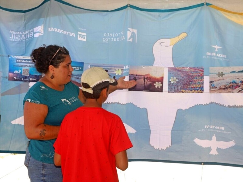 Para sensibilizar os visitantes sobre essa problemática e provocar reflexões sobre o tema, a equipe do Projeto Albatroz contou com banners informativos, painel de envergadura que compara as asas de um albatroz às de outras espécies de aves, miniatura do barco de espinhel para detalhar as medidas mitigadoras da captura incidental, anzol com hookpod para demonstrar o uso do dispositivo aliado à tecnologia na pesca.