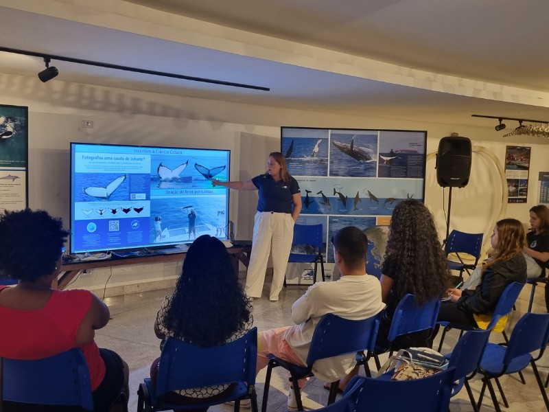 A primeira delas foi o Curso para Educadores Ambientais, cujo tema era “Os Grandes Animais Migratórios da Rede Biomar”. No encontro, realizado no período noturno, as equipes dos dois projetos apresentaram as principais características e adaptações biológicas dos albatrozes e também das baleias-jubarte, essas últimas, que podem ser facilmente avistadas em saídas de barco pela região.