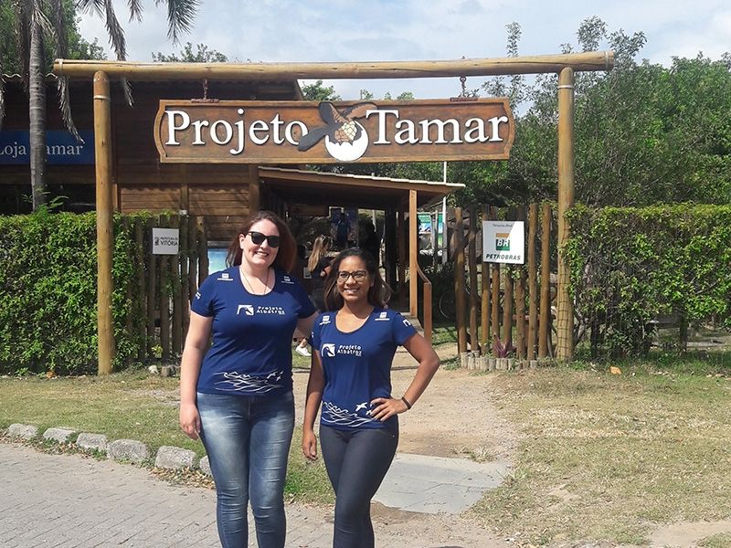A primeira parada de Jéssica Branco, coordenadora de Comunicação do Projeto Albatroz, e Tatianne Fonseca, assistente, foi o Centro de Visitação do Tamar, na capital do estado. Por lá, foram recebidas pela supervisora das confecções do da instituição, Tuta Burtet, e pela gestora do Centro de visitantes do projeto Tamar em Vitória, Denise Rieth.