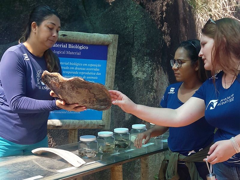 Antes do início da visita monitorada, conheceram mais sobre a história do Projeto Tamar, que tem quase 40 anos de comprometimento com a conservação das tartarugas marinhas. Elas e os albatrozes compartilham duas ameaças à sobrevivência: o lixo marinho e a pesca de espinhel pelágico. Por isso, são parceiros de longa data na troca de informações sobre pesca e captura de animais, visando desenvolver medidas mitigadoras.