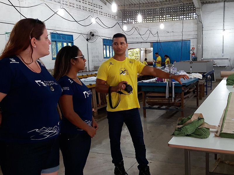Recebidas por Gleusiane dos Santos e Hélio Luiz Alcântara, responsáveis pela fábrica, as representantes do Projeto Albatroz puderam conhecer mais sobre a história da confecção e seu envolvimento com a comunidade local. Hélio, nascido em Regência e criado entre as atividades do projeto, contou mais sobre o desenvolvimento tecnológico da fábrica - que começou pequena e hoje emprega cerca de 40 moradores da comunidade. A instalação da confecção foi importante para a sensibilização dos moradores, porque os pescadores da vila se alimentavam das tartarugas da região e com elas fabricavam artesanatos.