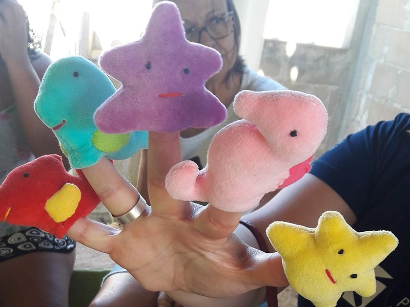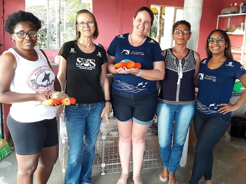 As representantes da entidade conversaram com a equipe do Projeto Albatroz sobre as peças de artesanato desenvolvidas por elas. Com apoio do Tamar, que cede espaço e sobras de tecido e materiais das fábricas, as mulheres produzem peças inspiradas no ecossistema marinho. O valor da venda dos produtos artesanais é revertido em renda para as artesãs.