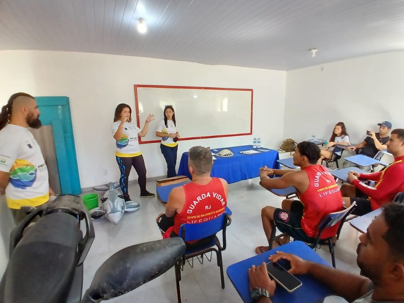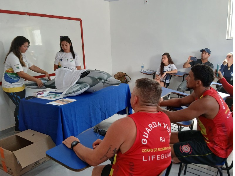 A atuação do Instituto Albatroz frente ao PMP na Região dos Lagos foi apresentada pelo gerente operacional da instituição, Rodrigo Troina, enquanto a médica veterinária Janaína Rocha e a técnica de Campo Juliana Geraldo ensinaram técnicas de resgate de aves, tartarugas e mamíferos marinhos. Todos reforçaram a importância da parceria com os guarda-vidas e com a população em geral para acionar as equipes de resgate tão logo observem animais marinhos encalhados nas praias, vivos ou mortos. O acionamento deve ser feito pelo telefone 0800 991-4800. “Contar com o apoio de profissionais como os guarda-vidas é um grande reforço para o nosso trabalho”, frisou Rodrigo.