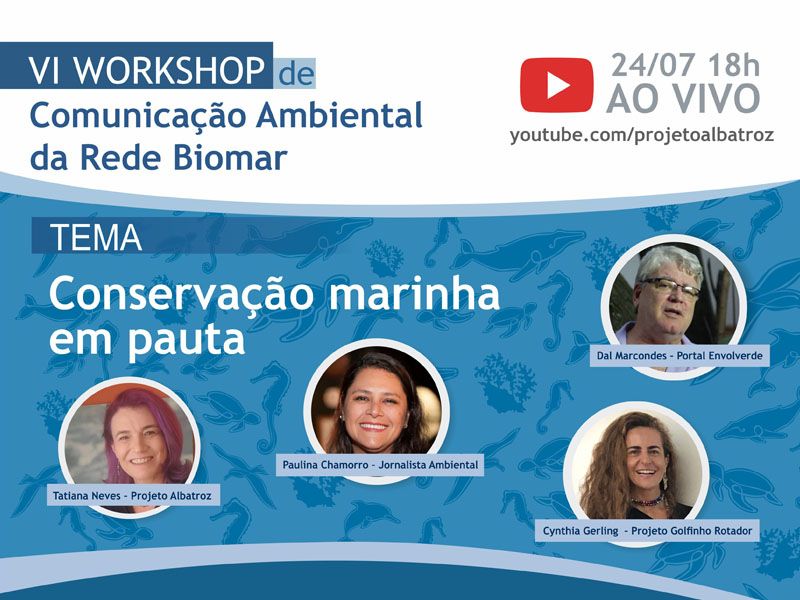 21/07 - 18h - V Workshop de Comunicação Ambiental da Rede Biomar – Imagem e Oceano – com Projeto Albatroz, Baleia Jubarte, Meros do Brasil e fotógrafo da National Geographic no fb.com/palbatroz e youtube.com/projetoalbatroz