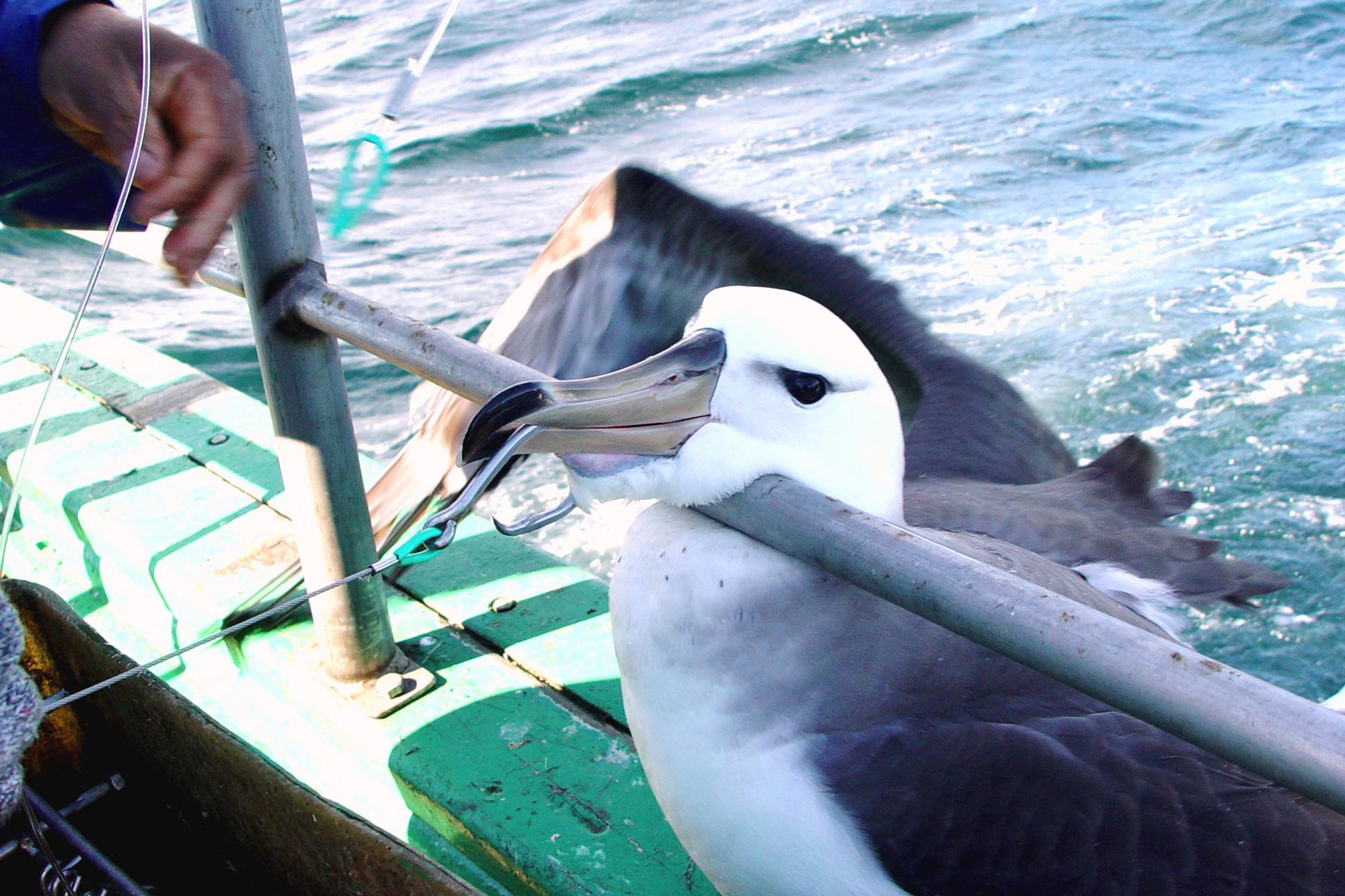 Durante o recolhimento dos anzóis em pescarias de espinhel ou outras pescarias oceânicas com linha e anzol, as aves acabam fisgadas ao tentar comer as iscas e são trazidas a bordo vivas, e sua sobrevivência depende de procedimentos cuidados para a retirada do anzol, visando tanto a segurança do pescador (evitar bicadas) quanto a integridade da ave.