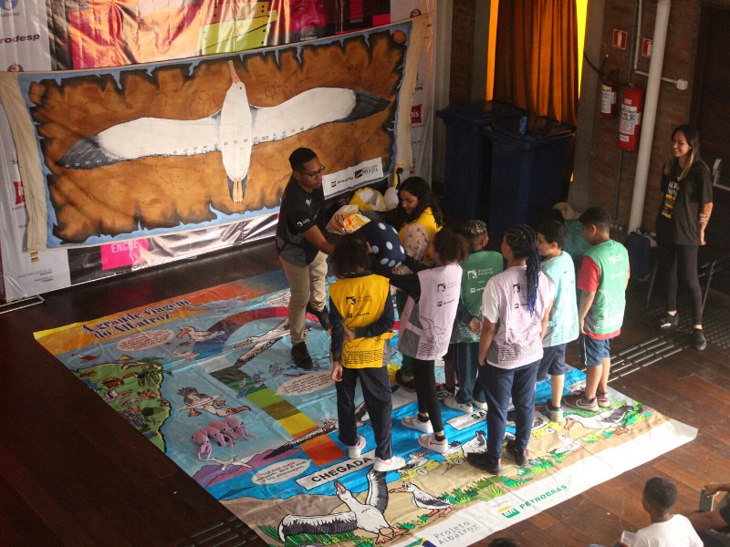 As atividades começaram com uma palestra da equipe de educação ambiental sobre os albatrozes, sua biologia e o oceano, ecossistema onde passam a maior parte da vida voando, até a hora de retornarem às ilhas para encontrar seu parceiro e se reproduzir. Buscando escutar as crianças e tirar dúvidas sobre essas aves marinhas, os educadores também provocaram reflexões sobre o papel de cada um na conservação do oceano e de toda a biodiversidade a partir de ações simples, como diminuir o consumo de plástico e descartar corretamente os resíduos.