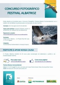 Um Concurso Fotográfico está agitando as redes sociais do Projeto Albatroz. Antes de começar o Festival Albatroz Socioambiental, todos que são apaixonados por fotografia podem participar e enviar fotos com os seguintes temas: Socioambiental, Biodiversidade e Ameaças/Impacto para albatroz@projetoalbatroz.org.br. Consulte o regulamento do concurso em: http://projetoalbatroz.com.br/upload/arquivo/tipoarquivo/38.pdf.