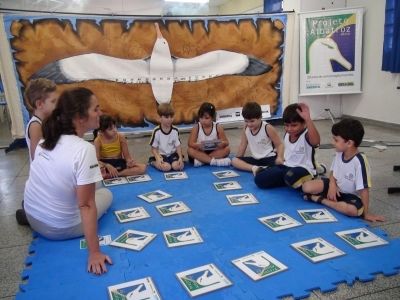 Ontem (26), das 13h30 às 15h, o Projeto Albatroz esteve na escola particular Souza Brasil, em Santos (SP). O objetivo da visita foi apresentar o Projeto “Albatroz na Escola”, do programa de educação ambiental da organização, para os alunos do 1º ano do ensino fundamental. Os estudantes interagiram com o jogo da memória marinha e com o painel de envergadura. Esse último mostra uma ilustração de albatroz-viageiro (Diomedea exulans) com as asas abertas. O painel permite que as crianças possam comparar seu tamanho com a envergadura dessa espécie de albatroz, que pode chegar a 3,5 metros.