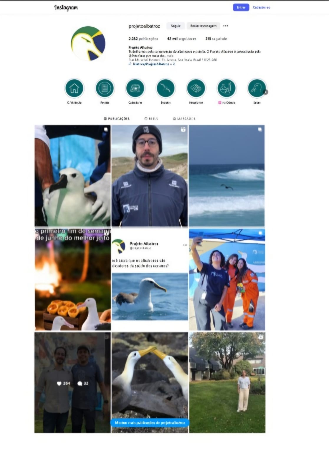 Beatriz Viana, analista de comunicação digital do Projeto Albatroz, destaca que “o digital e o físico são complementos naturais um do outro, e ambos têm um papel crucial na sensibilização. Pelas imagens e textos conseguimos chegar a lugares que nós, como indivíduos, às vezes não conseguimos. A gente voa muito longe, até os ninhais de albatrozes na Nova Zelândia, por exemplo. E com os materiais expositivos mostramos às pessoas onde as aves estão, uma realidade que talvez nunca conheceriam. Nosso trabalho funciona muito quando esses dois complementos agem juntos, quando a pessoa está conosco nos eventos e depois, vai nas redes sociais e descobre um mundo novo que está ali na palma da mão”.