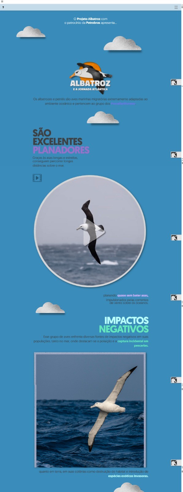 O Projeto Albatroz, patrocinado pela Petrobras, atua há mais de 30 anos na conservação das aves marinhas e na sensibilização sobre a importância da prática de uma pesca mais sustentável. Utilizando os recursos da semiótica, e justamente porque essas aves não fazem parte do cotidiano da maioria das pessoas, o Projeto aposta, por exemplo, na força das imagens e dos materiais expostos no Centro de Visitação em Cabo Frio (RJ). Entre os destaques estão painéis explicativos com informações sobre as espécies, esqueletos e réplicas de albatrozes em tamanho real, além de exemplares taxidermizados. O espaço também conta com um painel específico que apresenta imagens e dados sobre os albatrozes ameaçados de extinção, tudo pensado para aproximar o público da causa. Por meio de campanhas visuais, exposições fotográficas, vídeos educativos e registros em campo o Projeto transforma o invisível em visível, mostrando assim à sociedade as ameaças que essas aves enfrentam, como a captura incidental, e os impactos das atividades humanas sobre os ecossistemas marinhos.