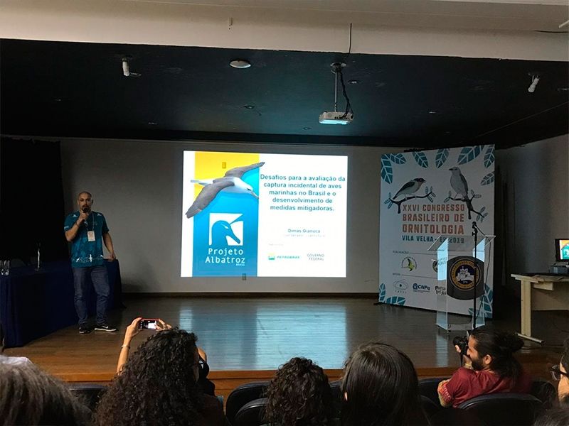 Na terça-feira (9), Dr. Dimas Gianuca e Alice Pereira participaram do simpósio ‘Pesquisa com aves marinhas no Brasil: estado atual do conhecimento, desafios e perspectivas futuras’. Em sua palestra, Gianuca abordou a biologia e ecologia dos albatrozes, relacionando sua estratégia de vida com os perigos a que estão expostos, e como as interações negativas entre a pesca e as aves estão resultando em reduções populacionais, que se persistirem, poderão resultar na extinção de várias espécies.
